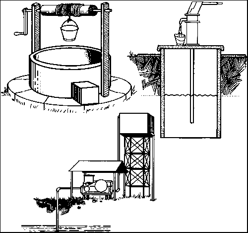 After the well is constructed, the water must be raised from the aquifer to the surface so that you can use it. There are several ways that this can be done. Look at the illustrations. Which methods are used for the wells in your community?