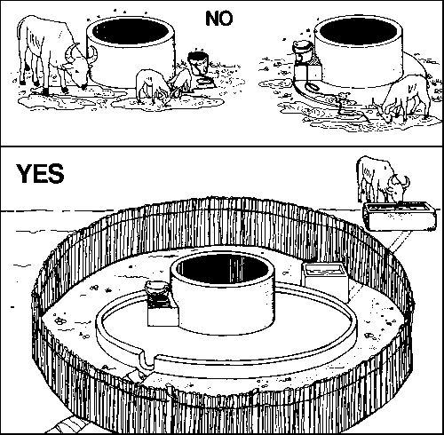 6. Protect the well site from animals by building and maintaining a fence or bush hedging around it, and by constructing a water trough for animals at a safe distance from the well.