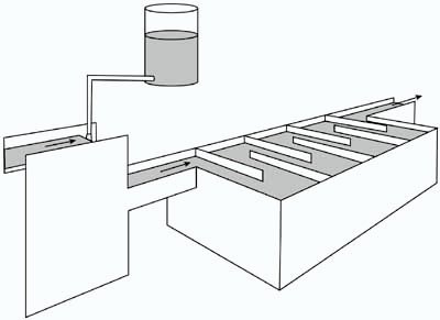 · sedimentation is achieved by the settling of particles in slow moving water | |