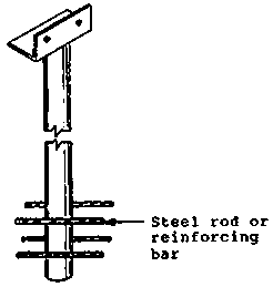 a) Iron posts: - The diameter of the iron post depends on the number of piers or stumps per square metre, number of stories and the height of floor level above ground level. Angle iron has to be welded on top and steel rods must be welded at the lower part of the iron post to increase the area of support. The other method is to flare the bottom of the pipe or post.