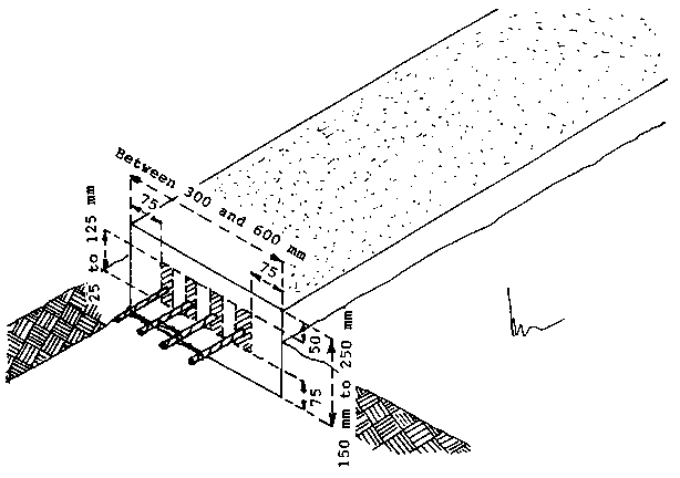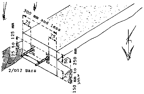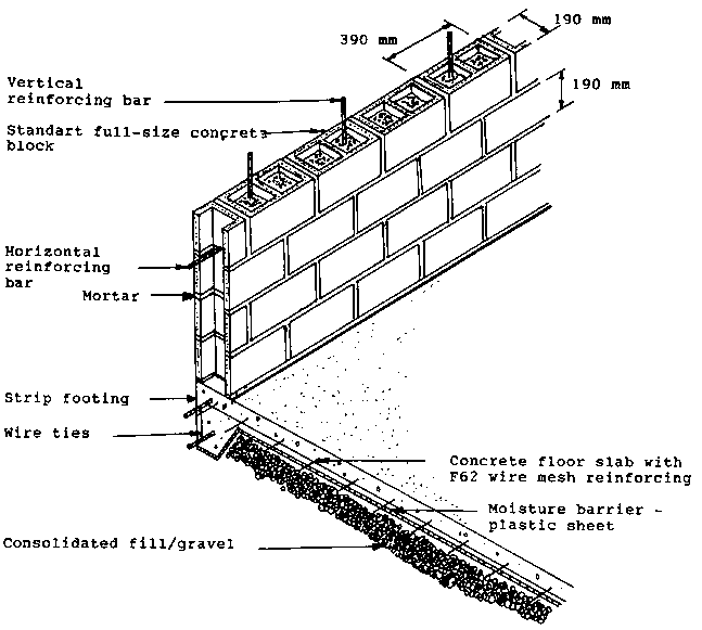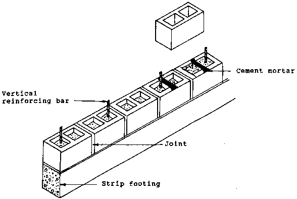 Strip footing is the thicker section of concrete at the base of a column, load-bearing wall, masonry wall or block wall. The strip footing is reinforced by D12 (deformed 12 mm diameter) bars. The cement mortar should be composed of one part by volume of cement to four parts by volume of sand. (1:4) For vertical reinforcement again D12 bars are used and spaced 600 mm apart too.