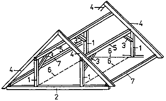 1 king post, 2 attic beam, 3 angle brace, 4 roof rafter, 5 trussed purlin, 6 room limitation by king posts, 7 inferior purlin