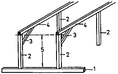 1 wooden beam, 2 straining direction of boarding, 3 foot runner, 4 head runner, 5 post, 6 uncovered nailing of boarding
