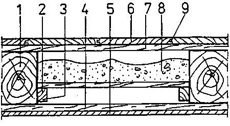 1 beam, 2 supporting laths. 3 laths, 4 parquet deals, 5 tongue, 6 filler, 7 timbering, 8 lathwork/plaster, 9 planed boarding fitted between the beams