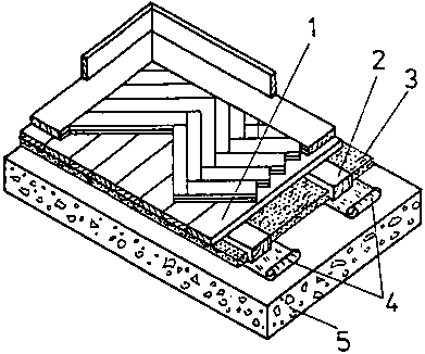 1 false floor, 2 beam layer, 3 insulating material, 4 bituminous felt strips, 5 solid substructure