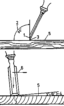 1 flank of the cutting edge, 2 right angle, 3 cutting edge, 4 acute angle, 5 surface of the workpiece, 6 working direction