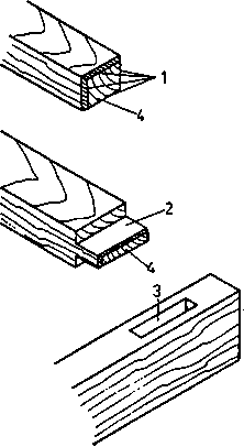 1 chamfers at the bottom edges of a foot (leg), 2 tenon, 3 mortise, 4 end-grained faces