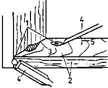 1 glue residues, 2 workpiece surfaces, 3 workpiece corners, 4 ripping chisel blade, 5 acute angle